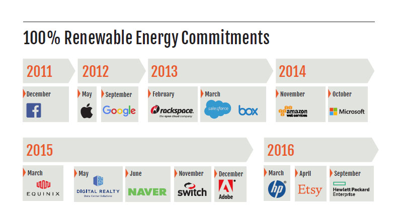 國際上,為了扭轉(zhuǎn)數(shù)據(jù)中心行業(yè)能耗與碳排放劇增的局面,企業(yè)已經(jīng)開始采取行動。2011年以來,國際領(lǐng)先的互聯(lián)網(wǎng)企業(yè)已紛紛作出向100%清潔、低碳的能源轉(zhuǎn)型的承諾,其中包括谷歌、蘋果、亞馬遜、臉書等等。這意味著,它們將以100%的可再生能源為他們旗下所有的數(shù)據(jù)中心供電。