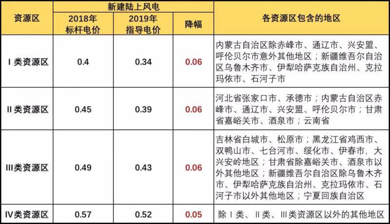 據(jù)會(huì)議討論結(jié)果,I、II、III、IV類陸上風(fēng)資源區(qū)將要出臺的“指導(dǎo)性電價(jià)”,分別為0.34元/千瓦時(shí)(人民幣。下同)、0.39元/千瓦時(shí)、0.43元/千瓦時(shí)、0.52元/千瓦時(shí),相比2018年同期,下降幅度范圍分別在0.06元、0.06元、0.06元、0.05元。