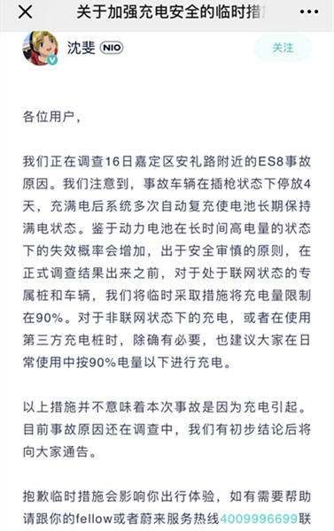 在西安維修站ES8自燃事件之后,5月16日上海嘉定區(qū)安禮路附近的一臺(tái)蔚來(lái)ES8又突然冒煙,在此次事故原因尚未查明的情況下,5月17日晚間,蔚來(lái)汽車(chē)能源副總裁沈斐在蔚來(lái)APP上發(fā)布了《關(guān)于加強(qiáng)充電安全的臨時(shí)措施》稱(chēng),事故車(chē)輛在插槍狀態(tài)下停放4天,充滿(mǎn)電后系統(tǒng)多次自動(dòng)復(fù)充使電池長(zhǎng)期保持滿(mǎn)電狀態(tài),鑒于動(dòng)力電池在長(zhǎng)時(shí)間高電量的狀態(tài)下的失效概率會(huì)增加,出于安全審慎的原則,在正式調(diào)查結(jié)果出來(lái)之前,對(duì)于處于聯(lián)網(wǎng)狀態(tài)的專(zhuān)屬樁和車(chē)輛,蔚來(lái)將臨時(shí)采取措施將充電量限制在90%。