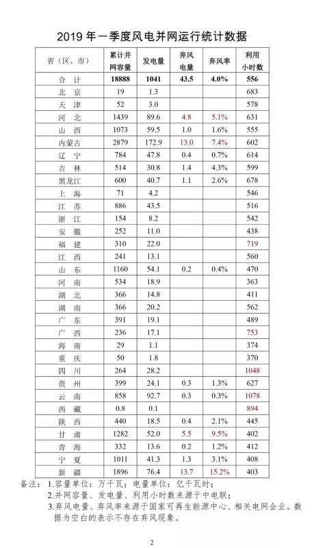 2019年1-3月,棄風(fēng)仍較為嚴(yán)重的地區(qū)是新疆(棄風(fēng)率15.2%、棄風(fēng)電量13.7億千瓦時(shí))、甘肅(棄風(fēng)率9.5%、棄風(fēng)電量5.5億千瓦時(shí))、內(nèi)蒙古(棄風(fēng)率7.4%、棄風(fēng)電量13.0億千瓦時(shí))。