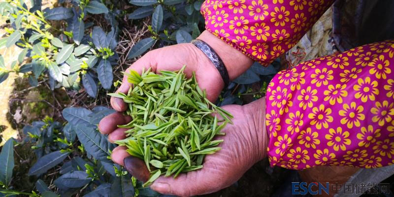 浙能松陽光伏電站的采茶工人展示剛采摘的龍井茶。徐利輝 攝