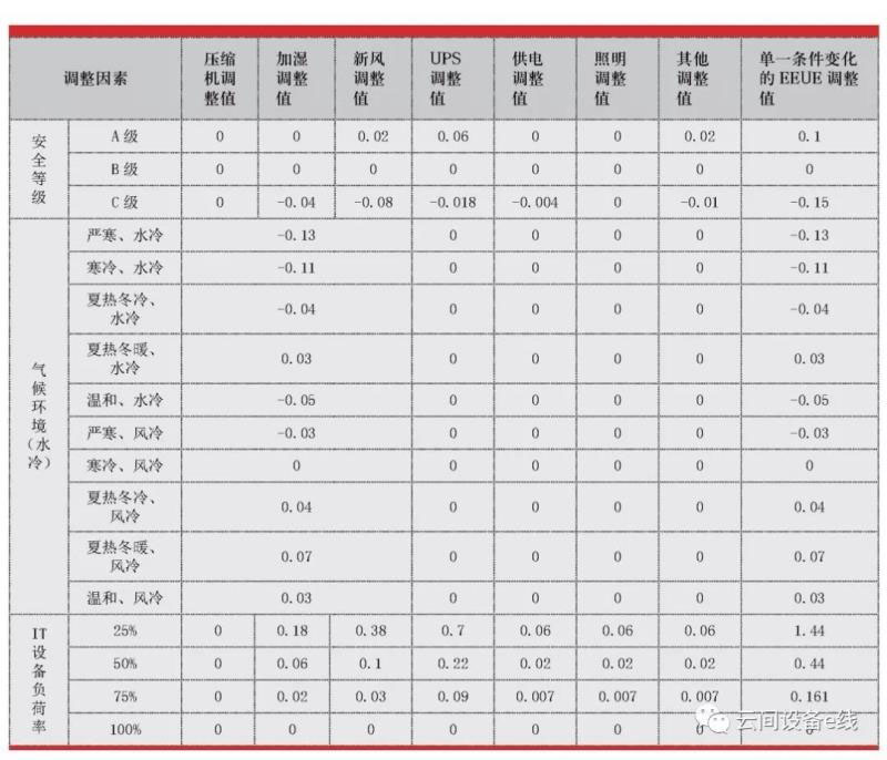 2016年我國發(fā)布的GB/T32910-2016《數(shù)據(jù)中心資源利用第3部分:電能能效要求和測量方法》提出了EEUE指標,定義與PUE相同。同時,為了方便不同數(shù)據(jù)中心的能耗指標進行比較,該國標考慮了數(shù)據(jù)中心安全等級、氣候條件和IT設備負荷率等因素,提出了調(diào)整模型。不同數(shù)據(jù)中心在比較EEUE時,需使用EEUE修正值。EEUE修正值計算公式如下: