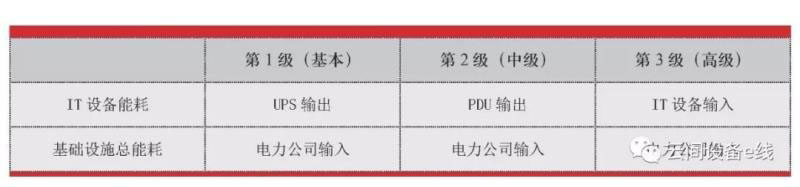 TGG給出了PUE計算時的三種測量采集方法。數(shù)據(jù)中心總耗電量Pt都是電力公司對數(shù)據(jù)中心的輸入。如果數(shù)據(jù)中心所在的建筑物是多用途的,必須對數(shù)據(jù)中心的總耗能進行識別,需要減去辦公區(qū)域的用電。但是用于數(shù)據(jù)中心技術支持的總控中心的用電必須包括在內(nèi)。IT設備總耗電量PIT的采集點有三種:第1級是基本級別,采集點是UPS的輸出;第2級是中級級別,采集點是機房內(nèi)配電柜的輸出;第3級是高級級別,采集點是機柜內(nèi)電源插座的輸出,也就是IT設備的輸入,具體見表1。這三種計算方法的采集點對電力使用的功耗或電量的采集的顆粒度要求逐級提高。目前,我國多數(shù)數(shù)據(jù)中心采用的是第1級的采集和計算方式。因此,得到的PUE數(shù)值也比第2級和第3級數(shù)值更低。