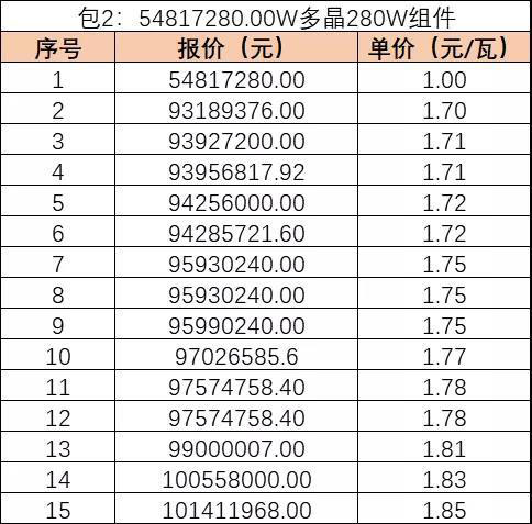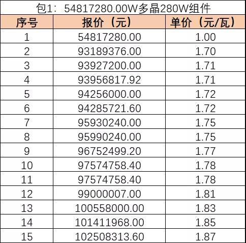 該項(xiàng)目組件交貨期為2019年7月-9月。據(jù)了解,其中,由某企業(yè)報(bào)出的最低價(jià)1元/瓦因信息填寫錯(cuò)誤已澄清。去除該報(bào)價(jià)后,最低報(bào)價(jià)1.70元/瓦,最高報(bào)價(jià)1.87元/瓦,均價(jià)在1.76元/瓦左右。該價(jià)格為人民幣含稅價(jià)。