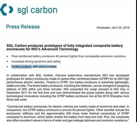 此前西格里碳素公司在其官網(wǎng)披露的與蔚來合作的聲明及其研發(fā)的動(dòng)力電池外殼樣品