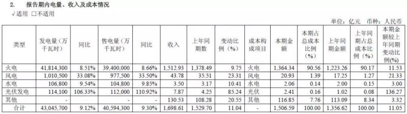 截至2018年底,公司可控發(fā)電裝機(jī)容量為105,991兆瓦,其中天然氣發(fā)電機(jī)組裝機(jī)容量為10,419兆瓦,占比9.83%,風(fēng)電發(fā)電機(jī)組裝機(jī)容量為5,138兆瓦,占比4.85%,光伏發(fā)電機(jī)組裝機(jī)容量為959兆瓦,占比0.90%,燃油發(fā)電機(jī)組裝機(jī)容量為600兆瓦,占比0.57%,水力發(fā)電裝機(jī)容量352兆瓦,占比0.33%,生物質(zhì)發(fā)電機(jī)組裝機(jī)容量為25兆瓦,占比0.02%。其余的83.50%為燃煤發(fā)電機(jī)組,裝機(jī)容量為88,498兆瓦,其中包括14臺(tái)百萬(wàn)千瓦超超臨界機(jī)組,以及國(guó)內(nèi)蒸汽參數(shù)最高的660兆瓦高效超超臨界機(jī)組和國(guó)內(nèi)首次采用的超超臨界二次再熱機(jī)組,公司現(xiàn)有的燃煤發(fā)電裝置技術(shù)性能先進(jìn)、維護(hù)保養(yǎng)精良、能耗指標(biāo)優(yōu)異、污染排放達(dá)標(biāo),具有持久的環(huán)境保護(hù)價(jià)值和市場(chǎng)競(jìng)爭(zhēng)優(yōu)勢(shì)。