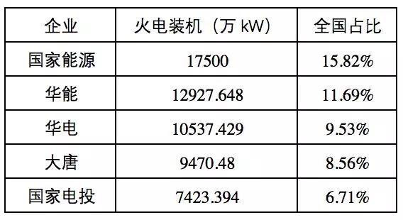 表:2017年底五大電力集團(tuán)的火電裝機(jī)情況