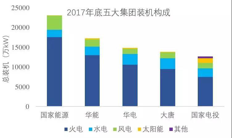 圖:2017年底五大電力集團(tuán)的裝機(jī)結(jié)構(gòu)