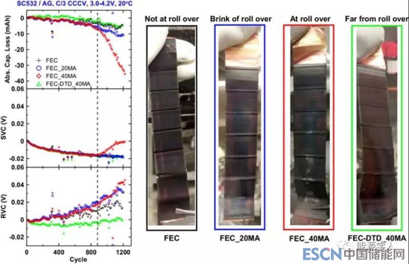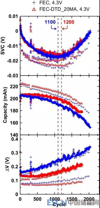 上圖6為標準長期循環(huán)下的ΔV、容量和SVC參數(shù)變化曲線,可以看出,對于FEC和FEC-DTD_20MA電池而言,SVC在1100到1200圈之間有明顯上升,表示著鍍鋰現(xiàn)象的發(fā)生。SVC的變化清楚地確定了鍍鋰的開始時間的循環(huán)計數(shù),是一個非常重要的方法。