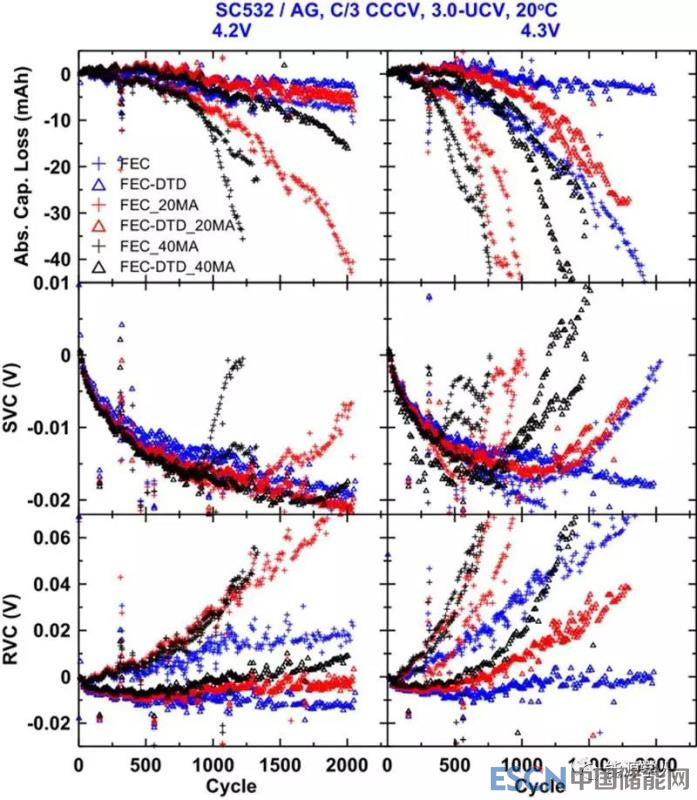 上圖5為不同電池在循環(huán)中,容量損失、SVC、RVC等參數(shù)的變化,圖左列循環(huán)到4.2V,右列循環(huán)到4.3 V,在4.2 V下測試的電池的初始容量接近210 mAh,在4.3 V下測試的電池的初始容量接近225 mAh。藍色十字表示FEC,藍色三角形表示FEC-DTD,用顏色表示MA含量:藍色為無MA,紅色為20 MA,黑色為40 MA。從圖上看,循環(huán)至4.2V的電池比循環(huán)至4.3V的電池具有更好的容量保持能力和更小的阻抗增長,且較高的MA含量導(dǎo)致電池在長期使用中急劇衰減,而DTD可顯著降低阻抗增長和延長壽命。