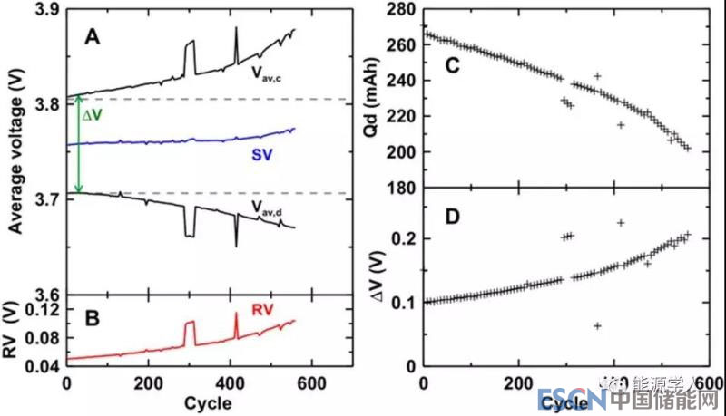 一個理想的鋰離子電池在其使用壽命中應(yīng)具有恒定的平均充電電壓(Vav,c)和恒定的平均放電電壓(Vav,d),但是,通常在長時間循環(huán)后,Vav,c增加,Vav,d下降。
