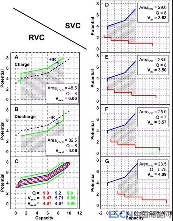 在圖2C中,當電壓固定(3 and 8 a.u.)時,阻抗增加限制了充電開始和結(jié)束附近的可用容量,可以看出,容量從9.9降至9.2,再降至8.0,均是因為阻抗增加所導(dǎo)致。此外,在圖2中,任何單個循環(huán)的充電容量(圖A)和放電容量(圖B)幾乎相同,但V-Q曲線下的區(qū)域明顯不同——充電平均電壓始終大于放電平均電壓。同時,增加IR會增加平均充電電壓,降低平均放電電壓,并降低總?cè)萘俊?