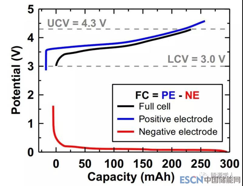 上圖1為全電池的首次電位-容量(V-Q)曲線,從圖中可以看出正、負電極對全電池V-Q曲線形狀的影響。一般來說,全電池的電位是正電極電位和負電極電位之間的差值。在本文中,全電池的電位最高不超過4.3 V(UCV),最低不低于3.0V (LCV),為了保持恒定的截止電位,UCV和LCV的位置會相對于容量軸移動,移動的位置取決于電池阻抗增長、鋰儲量損失和活性材料損失等多個因素。