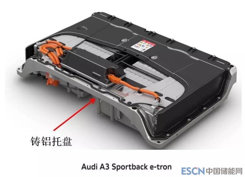 這種結構的托盤,框架結構特點不明顯,但是,整體強度可以滿足電池承截要求。常見于小能量電池系統(tǒng)結構。如下圖的Audi A3壓鑄托盤。