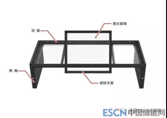 (3)、平頂天窗由側(cè)板、頂板、旋轉(zhuǎn)天窗組成,以單個(gè)機(jī)柜為擴(kuò)展模塊單元。旋轉(zhuǎn)天窗通過FuseLink銷釘與頂板聯(lián)接,工作狀態(tài)下天窗處于水平狀態(tài),消防狀態(tài)下FuseLink熔斷,天窗在重力作用下自動打開,保證滅火氣體進(jìn)入通道。平頂天窗外觀如圖所示。