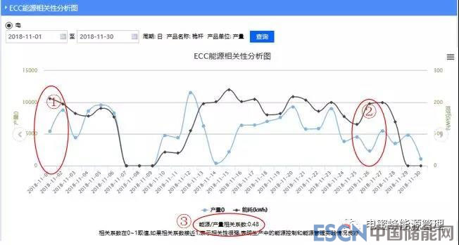 如上圖所示,依據(jù)產(chǎn)量數(shù)據(jù)和能耗數(shù)據(jù),產(chǎn)品加工單元11月份產(chǎn)量與能耗相關(guān)性分析: