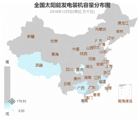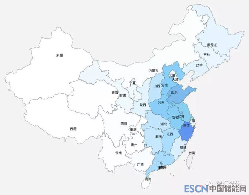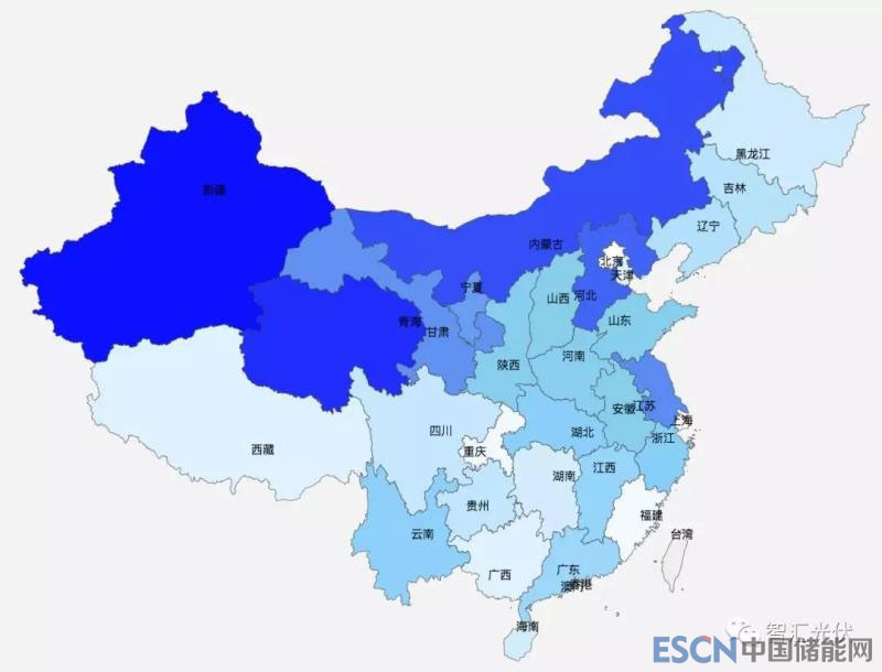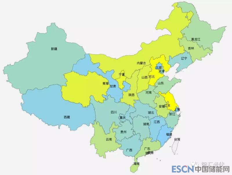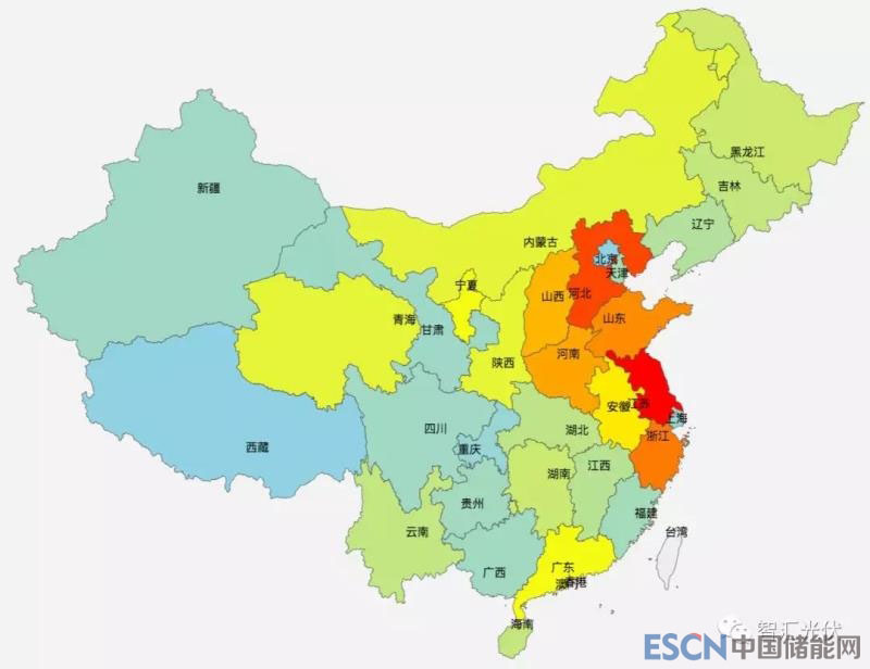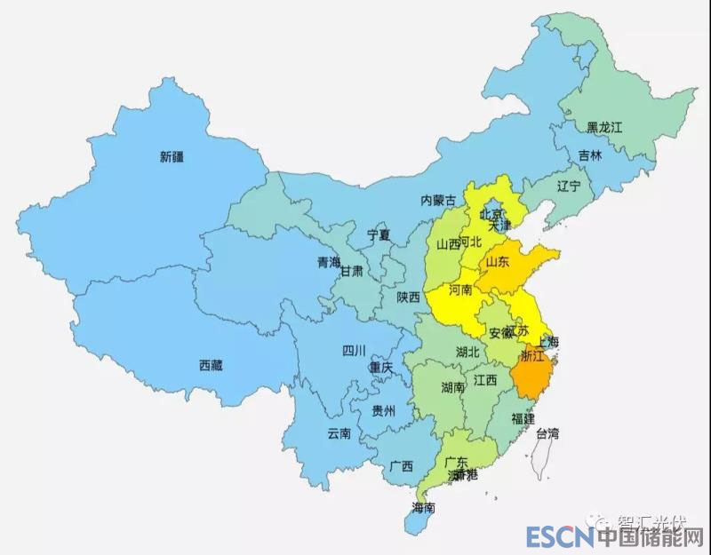 各省新增裝機情況如下圖所示。說明,由淺藍→黃→紅,顏色越深代表新增裝機規(guī)模越大。