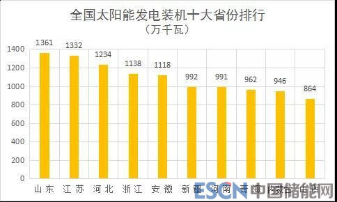 全國十大太陽能發(fā)電裝機省份分別是:山東1361 萬千瓦、江蘇1332 萬千瓦、河北1234 萬千瓦、浙江1138 萬千瓦、安徽1118 萬千瓦、新疆992 萬千瓦、河南991 萬千瓦、青海962 萬千瓦、內(nèi)蒙古946萬千瓦、山西864 萬千瓦。