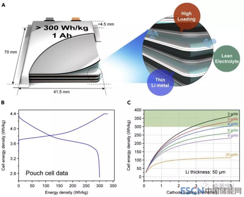 圖三、高能量的Li||NCM622 軟包電池。A)1 Ah軟包電池的方案,顯示三個(gè)關(guān)鍵參數(shù):高正極負(fù)載、薄Li金屬和少量的電解質(zhì),以獲得高能量密度;B)基于表一中所示的電池參數(shù),在300 Wh/kg Li||NCM622軟包電池的C/10處的第一次充放電曲線;C)計(jì)算的70× 41.5 mm Li||NMC622軟包電池的電池能量密度。