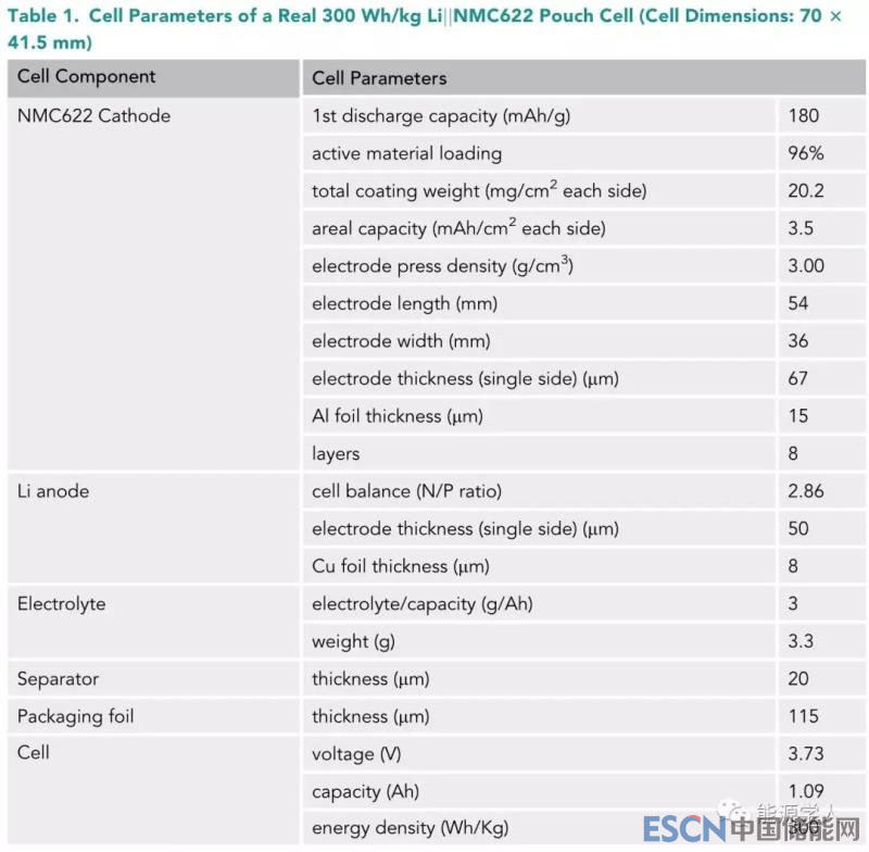 表一、300 Wh/kg Li||NMC622軟包電池的電池參數(shù)(電池尺寸:70 × 41.5 mm)
