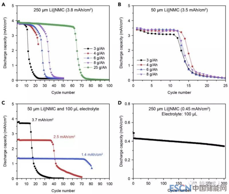 圖一、正極負(fù)載、負(fù)極金屬Li的厚度和電解質(zhì)含量對(duì)NMC622扣式電池的循環(huán)穩(wěn)定性的影響。A)3.8 mAh/cm2的正極和250 μm的Li箔負(fù)極對(duì)電池循環(huán)穩(wěn)定性的影響;B)3.5 mAh/cm2的正極和50 μm的具有不同電解質(zhì)量的Li箔負(fù)極對(duì)電池循環(huán)穩(wěn)定性的影響;C)具有100 mL電解質(zhì)的各種面積負(fù)載的正極和50 μm的Li箔負(fù)極對(duì)電池循環(huán)穩(wěn)定性的影響;D)0.45 mAh/cm2的正極、250 μmLi箔負(fù)極和100 μL電解質(zhì)在2C時(shí)的充放電,初始形成周期為C/10。