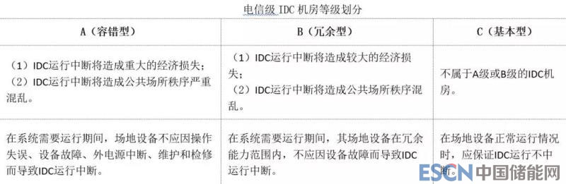 中國(guó)儲(chǔ)能網(wǎng)訊:電信級(jí)數(shù)據(jù)中心機(jī)房包括:主機(jī)房(數(shù)據(jù))、監(jiān)控中心、配套設(shè)備間(動(dòng)力、空調(diào)等設(shè)備間)、網(wǎng)絡(luò)接入間(光纜接入間)、用戶測(cè)試間、用戶休息間以及備間房間等。電信級(jí)IDC分為A、B、C三級(jí),各級(jí)數(shù)據(jù)中心機(jī)房技術(shù)要求參見下表所示。