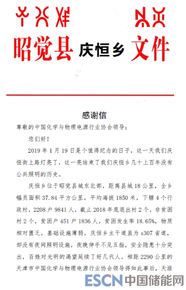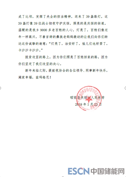 2019年中國化學與物理電源行業(yè)協(xié)會將繼續(xù)大力弘揚社會主義核心價值觀,大興友善互助、幫扶相助的社會風尚。協(xié)會將攜手更多會員單位和相關企業(yè),不僅肩負社會組織和企業(yè)的發(fā)展職責,更肩負起共同富裕的社會責任,在新能源的發(fā)展道路上拼搏前行。今年計劃為昭覺縣央摩祖鄉(xiāng)所在地安裝太陽能路燈,也熱忱歡迎會員單位和相關企業(yè)與我們一道,共同參與涼山彝族扶貧攻堅戰(zhàn),助力彝鄉(xiāng)百姓脫貧奔小康。