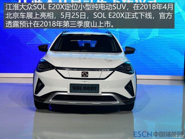 江淮大眾SOL E20X在2018年4月北京車(chē)展上亮相,當(dāng)時(shí)官方透露預(yù)計(jì)將在2018年第三季度山上市。5月25日,SOL E20X正式下線,8月7日有消息稱SOL E20X將在9月上市,但最終SOL E20X并沒(méi)有在2018年完成上市。