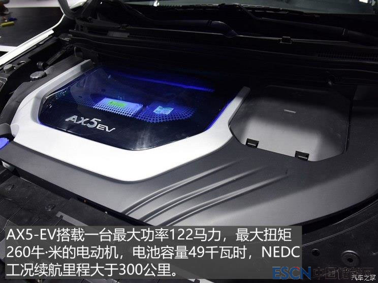 AX5-EV搭載一臺(tái)最大功率122馬力,最大扭矩260?!っ椎碾妱?dòng)機(jī),電池容量49千瓦時(shí),NEDC工況續(xù)航里程大于300公里。