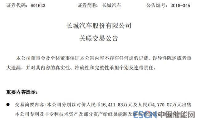 中國儲能網(wǎng)訊:據(jù)長城汽車公布,該公司于近日分別以對價(jià)約人民幣1.64億元及4770.07萬元出售123項(xiàng)公司專利、非專利技術(shù)資產(chǎn)及部份資產(chǎn)給蜂巢能源、蜂巢能源保定分公司。