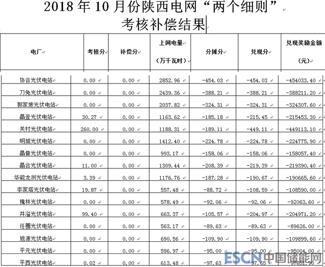 中國儲能網(wǎng)訊:12月25日,國家能源局西北監(jiān)管局印發(fā)《關(guān)于公布2018年10月份陜西電網(wǎng)“兩個細(xì)則”考核補(bǔ)償情況的通知》,根據(jù)《關(guān)于印發(fā)<西北區(qū)域發(fā)電廠并網(wǎng)運(yùn)行管理實(shí)施細(xì)則>及<西北區(qū)域并網(wǎng)發(fā)電廠輔助服務(wù)管理實(shí)施細(xì)則>的通知》(西北監(jiān)能市場〔2015〕28號)規(guī)定,2018年10月份陜西電網(wǎng)發(fā)電廠并網(wǎng)考核和輔助服務(wù)補(bǔ)償結(jié)果復(fù)核工作已完成,光伏電站考核補(bǔ)償結(jié)果如下: