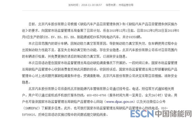 中國儲能網(wǎng)訊:11月30日,據(jù)國家市場監(jiān)督管理總局網(wǎng)站信息,北京汽車股份有限公司決定自2018年12月1日起,召回2012年2月28日至2018年5月8日生產(chǎn)的部分E、EV、EX、EU、EH、新能源威旺EV系列純電動汽車,共計(jì)69,358輛。召回原因?yàn)橐蛑苿又φ婵毡玫仍?,?dǎo)致制動助力真空泵失效,在車輛使用過程中會出現(xiàn)制動助力性能不足,甚至失去制動真空助力功能,存在安全隱患。北京汽車股份有限公司將對召回范圍內(nèi)的車輛進(jìn)行檢查,并免費(fèi)更換改進(jìn)后的制動助力真空泵,以消除安全隱患。