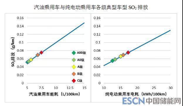 對(duì)于A00級(jí)、A0級(jí)和A級(jí)純電動(dòng)乘用車的典型車型,SO2的排放因子分別比同級(jí)別汽油乘用車高8%、10%和15%,而對(duì)于B級(jí)和C級(jí)車的典型車型,純電動(dòng)乘用車的SO2排放與汽油乘用車基本相當(dāng);當(dāng)A00級(jí)、A0級(jí)和A級(jí)純電動(dòng)乘用車的能耗分別低于11.7 kWh/100km、12.2 kWh/100km和13.1 kWh/100km時(shí),SO2的排放將低于同級(jí)別的汽油乘用車。