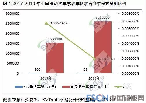 從事故車輛發(fā)生的概率來看,2017年電動汽車事故車輛占當(dāng)年全部登記的電動汽車保有量的比例為0.00673%,2018年這一比例降低到0.00195%。EVTank高級分析師趙滿祥指出,2017年事故車輛比例較高的主要原因在于2017年5月北京蟹島度假村89輛安凱電動巴士的自然事件,導(dǎo)致當(dāng)年事故車輛數(shù)量增加明顯。