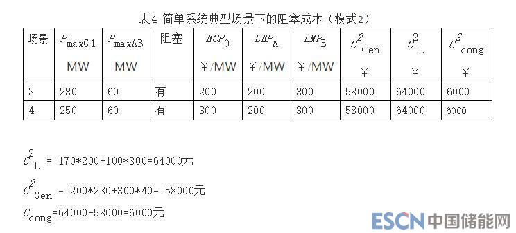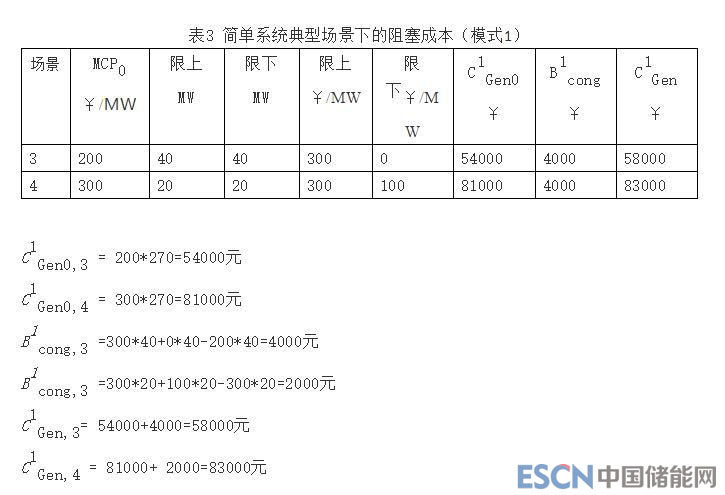 模式1-1:這種方法對(duì)應(yīng)英國(guó)第一階段改革Pool模式。由于阻塞出力增加的部分稱為限上,由于阻塞出力減小的部分稱為限下。對(duì)限上部分按照?qǐng)?bào)價(jià)支付。本例中,限上就是機(jī)組2由于阻塞增發(fā)的部分,在情況3、4中分別為40MW、20MW,按其報(bào)價(jià)300支付。對(duì)限下部分按照(MCP-報(bào)價(jià))支付(如果報(bào)價(jià)反映電廠的成本,這個(gè)差價(jià)就反映其由于阻塞損失的收益)。本例中,限下就是機(jī)組1由于阻塞減發(fā)的部分,在情況3、4中分別為40MW、20MW,分別按照(200-200)、(300-200)支付。表3中Σbuy指無(wú)阻塞下的總購(gòu)電成本,B1cong指模式1下阻塞造成的購(gòu)電成本的增加。B1cong包括三個(gè)部分:支付給限上機(jī)組的補(bǔ)償、支付給限下機(jī)組的補(bǔ)償、減少的限下機(jī)組的支出。