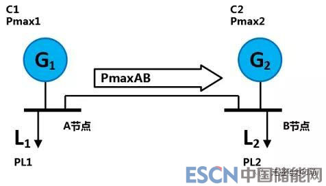 以簡(jiǎn)單兩節(jié)點(diǎn)系統(tǒng)為例進(jìn)行說(shuō)明。系統(tǒng)中具有兩個(gè)節(jié)點(diǎn)A和B,節(jié)點(diǎn)之間有一條線路AB,最大輸電能力是PmaxAB。A節(jié)點(diǎn)接有發(fā)電機(jī)G1和負(fù)荷L1,B節(jié)點(diǎn)接有發(fā)電機(jī)G2和負(fù)荷L2。