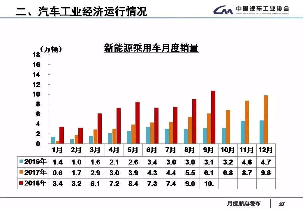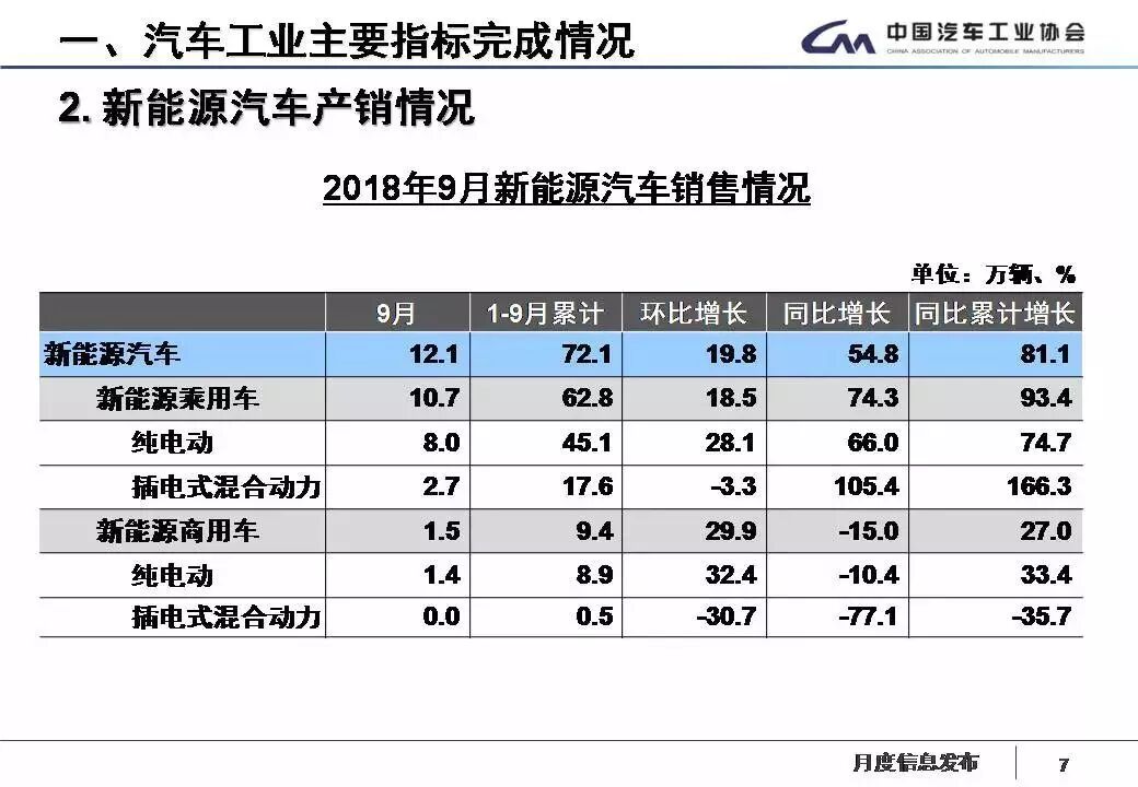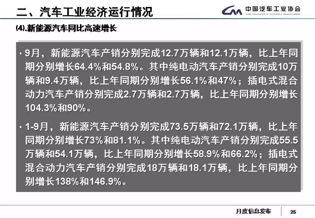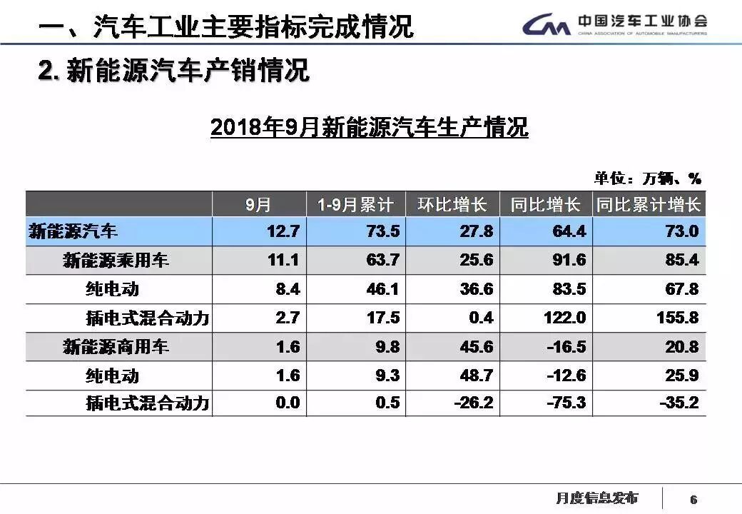 9月,新能源汽車產(chǎn)銷分別完成12.70萬(wàn)輛和12.12萬(wàn)輛,比上年同期分別增長(zhǎng)64.43%和54.79%。其中純電動(dòng)汽車產(chǎn)銷分別完成9.97萬(wàn)輛和9.42萬(wàn)輛,比上年同期分別增長(zhǎng)56.08%和46.98%;插電式混合動(dòng)力汽車產(chǎn)銷分別完成2.73萬(wàn)輛和2.70萬(wàn)輛,比上年同期分別增長(zhǎng)104.32%和89.97%。