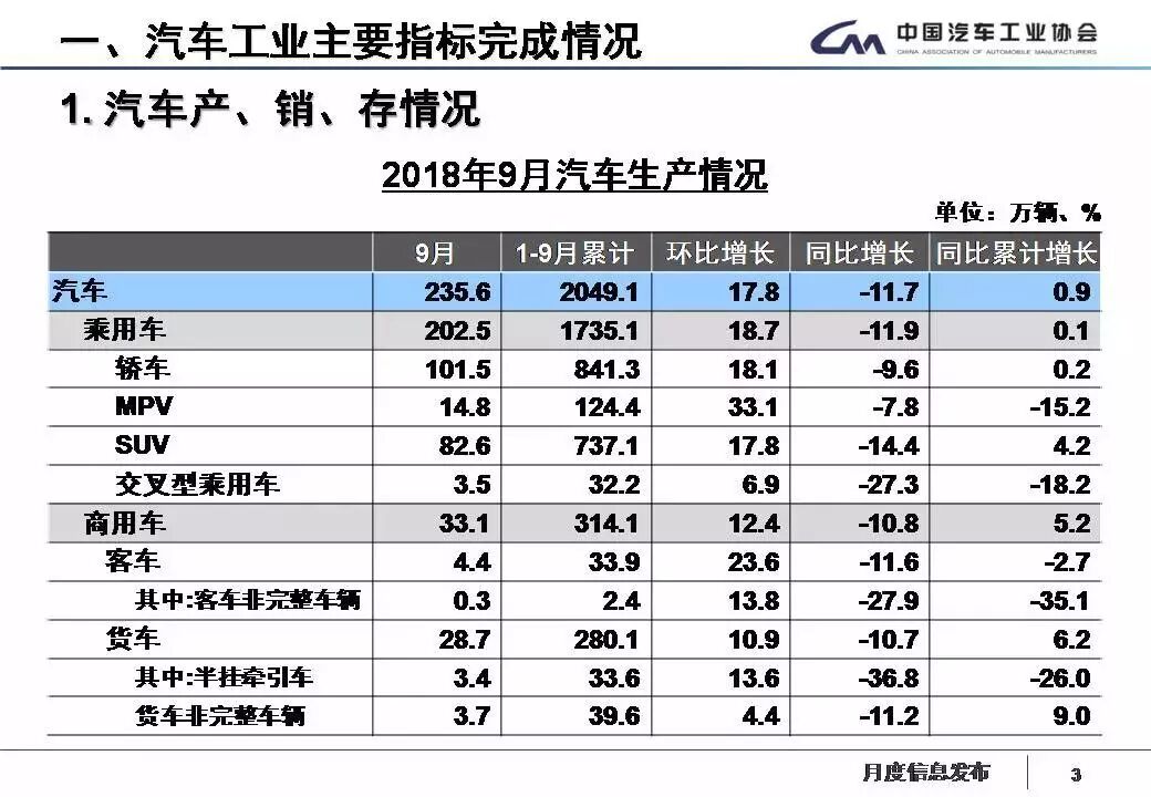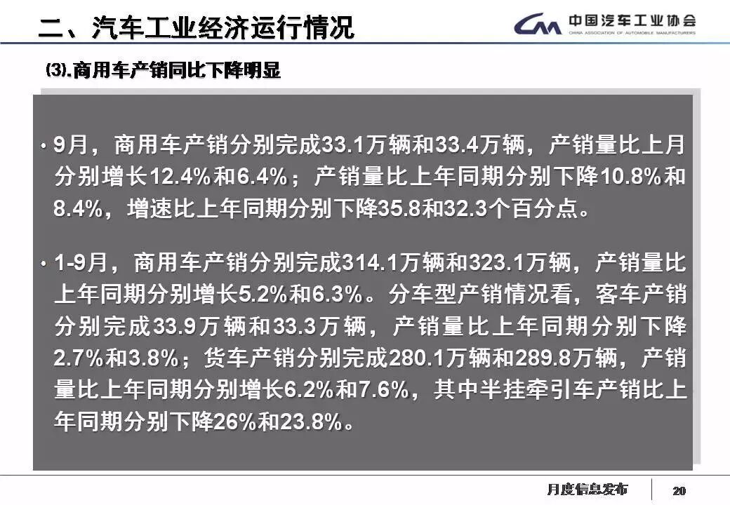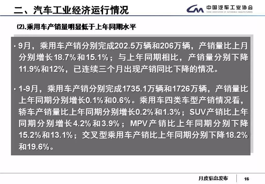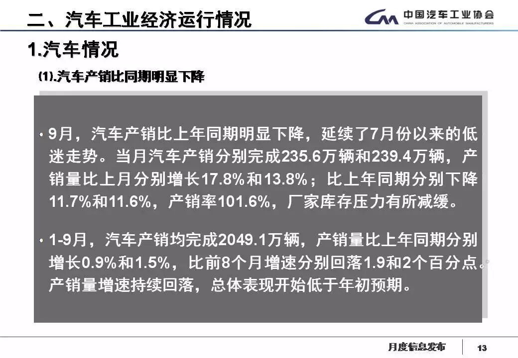 1-9月,汽車產(chǎn)銷2049.13萬(wàn)輛和2049.06萬(wàn)輛,同比增長(zhǎng)0.87%和1.49%,增速分別比1-8月回落1.90個(gè)百分點(diǎn)和2.04個(gè)百分點(diǎn)。其中乘用車產(chǎn)銷1735.07萬(wàn)輛和1725.97萬(wàn)輛,同比增長(zhǎng)0.13%和0.64%;商用車產(chǎn)銷314.07萬(wàn)輛和323.09萬(wàn)輛,同比增長(zhǎng)5.17% 和6.31%,產(chǎn)銷增速比上年同期明顯回落。