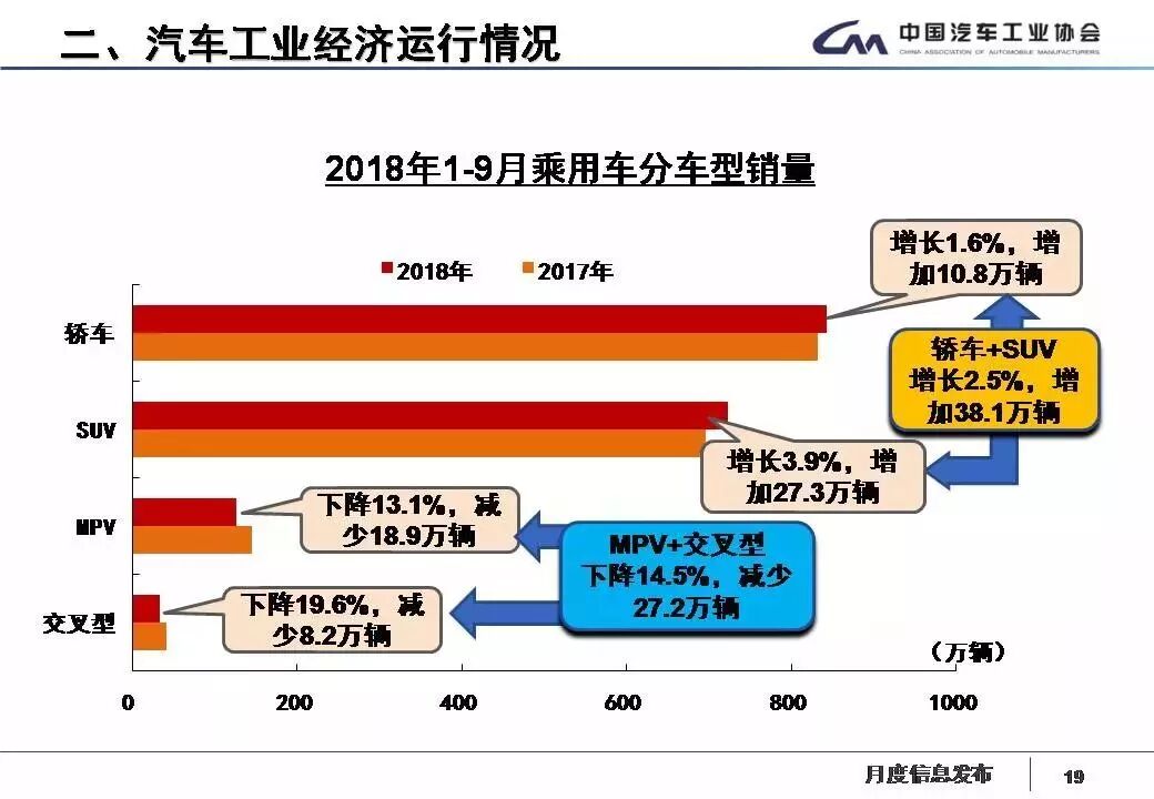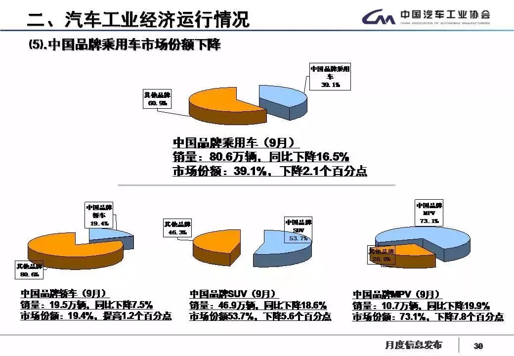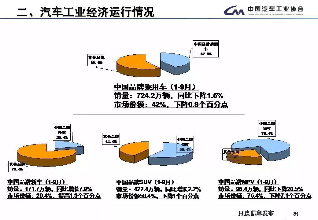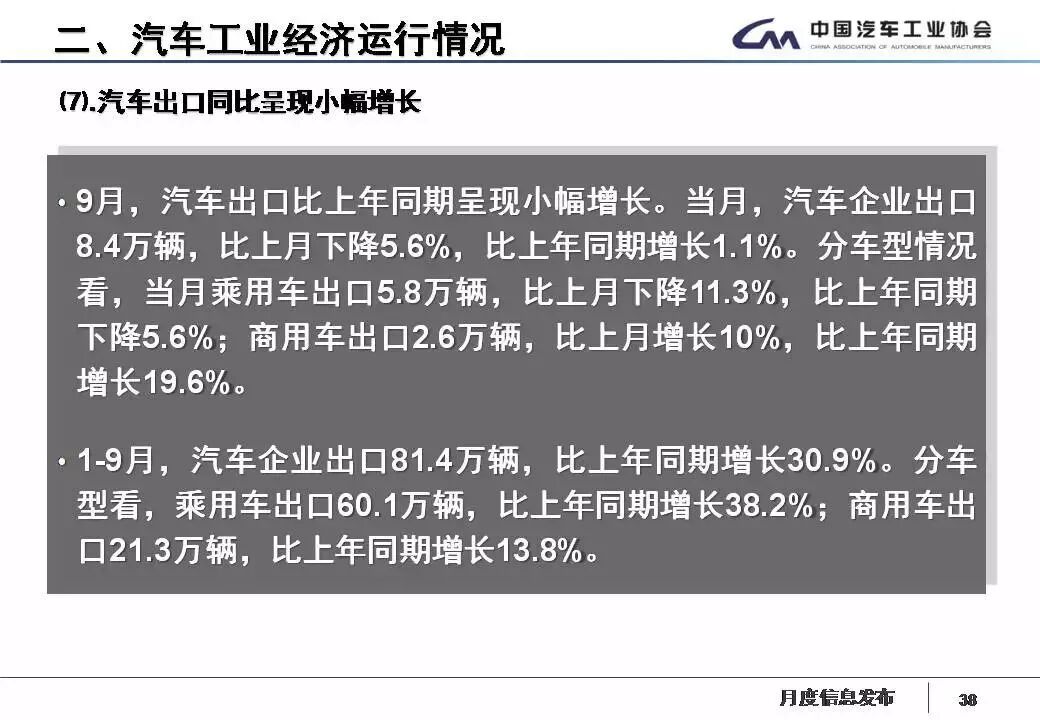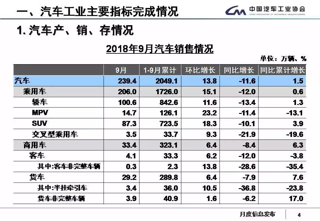 1-9月,汽車產(chǎn)銷2049.13萬(wàn)輛和2049.06萬(wàn)輛,同比增長(zhǎng)0.87%和1.49%,增速分別比1-8月回落1.90個(gè)百分點(diǎn)和2.04個(gè)百分點(diǎn)。其中乘用車產(chǎn)銷1735.07萬(wàn)輛和1725.97萬(wàn)輛,同比增長(zhǎng)0.13%和0.64%;商用車產(chǎn)銷314.07萬(wàn)輛和323.09萬(wàn)輛,同比增長(zhǎng)5.17% 和6.31%,產(chǎn)銷增速比上年同期明顯回落。