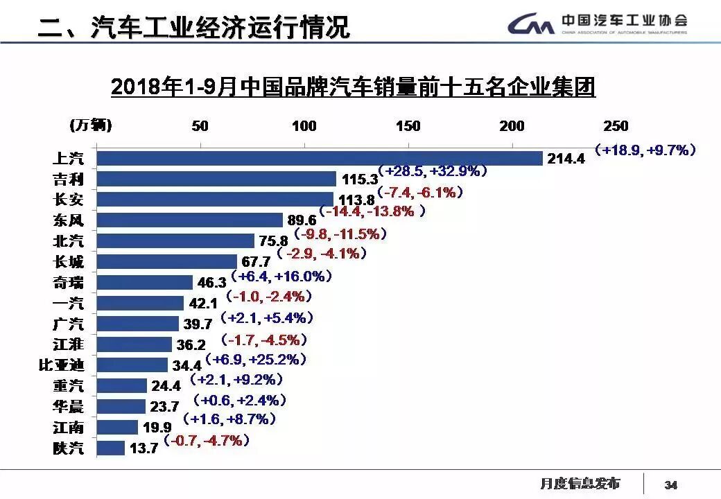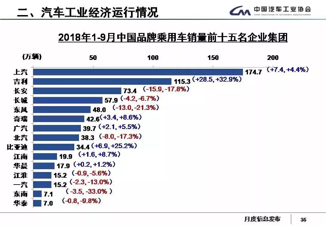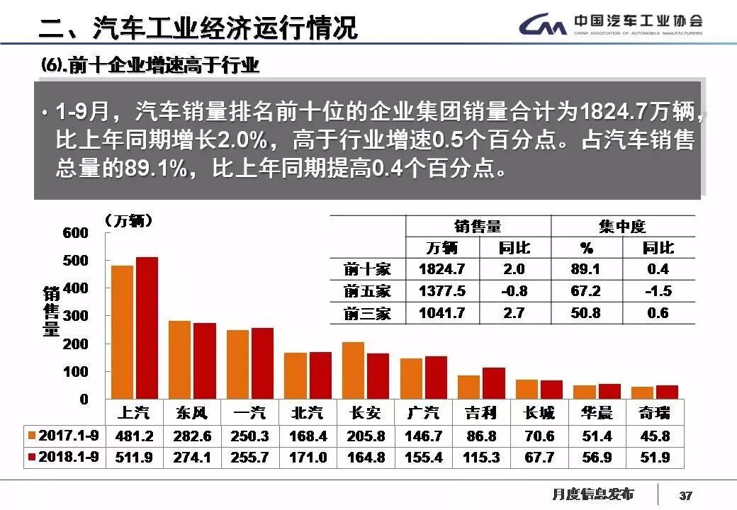 1-9月,汽車銷量排名前十位的企業(yè)依次是上汽、東風(fēng)、一汽、北汽、長(zhǎng)安、廣汽、吉利、長(zhǎng)城、華晨和奇瑞。與上年同期相比,長(zhǎng)安銷量下降明顯,東風(fēng)和長(zhǎng)城小幅下降,其他企業(yè)各有增長(zhǎng),吉利增速依然最快。1-9月,上述十家企業(yè)共銷售1824.67萬(wàn)輛,占汽車銷售總量的89.05%。