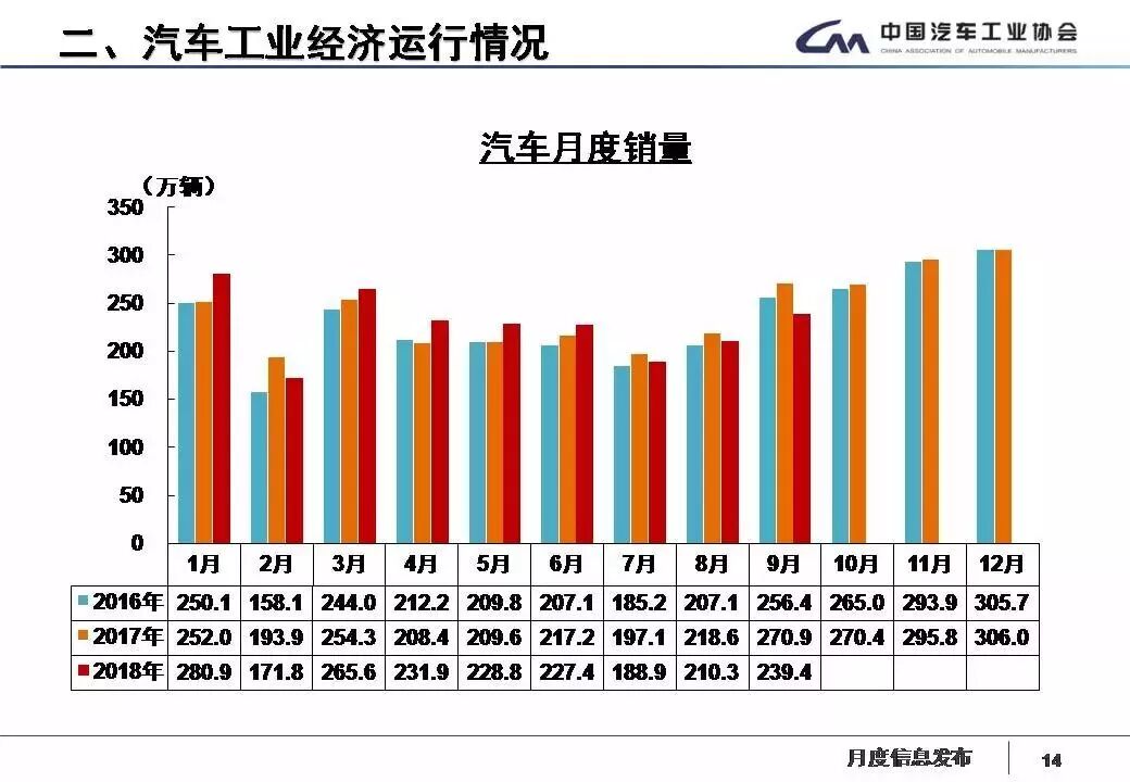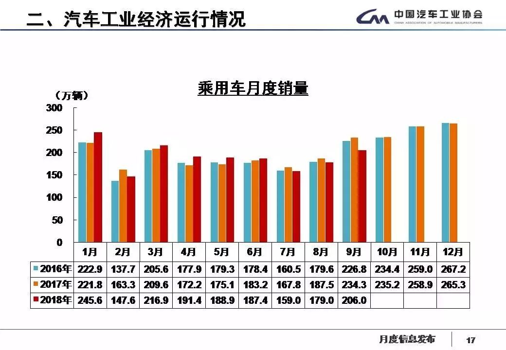 9月,汽車生產(chǎn)235.62萬(wàn)輛,環(huán)比增長(zhǎng)17.81%,同比下降11.71%;銷售239.41萬(wàn)輛,環(huán)比增長(zhǎng)13.82%,同比下降11.55%。其中,乘用車生產(chǎn)202.48萬(wàn)輛,環(huán)比增長(zhǎng)18.74%,同比下降11.86%;銷售206.05萬(wàn)輛,環(huán)比增長(zhǎng)15.12%,同比下降12.04%。商用車生產(chǎn)33.14萬(wàn)輛,環(huán)比增長(zhǎng)12.39%,同比下降10.82%;銷售33.36萬(wàn)輛,環(huán)比增長(zhǎng)6.38%,同比下降8.39%。