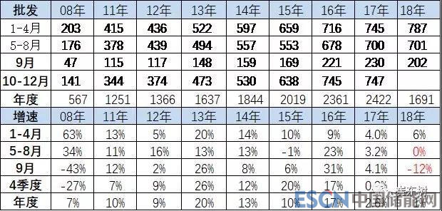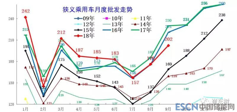 18年車市的批走勢出現(xiàn)較大下降趨勢,18年6月份達(dá)到183萬臺,同比增長3%,9月份批發(fā)銷量達(dá)到202萬臺,同比增速達(dá)到-12%。9月的批發(fā)增速劇烈下滑。18年1到9月份,總體同比增長仍達(dá)到1%的水平,基本符合預(yù)期。