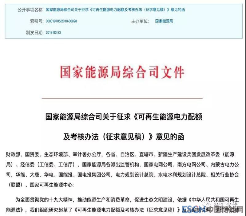 2018年3月23日,國家能源局對《可再生能源電力配額及考核辦法(征求意見稿) 》第一次征求意見;