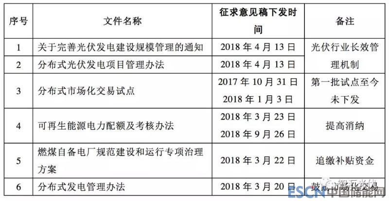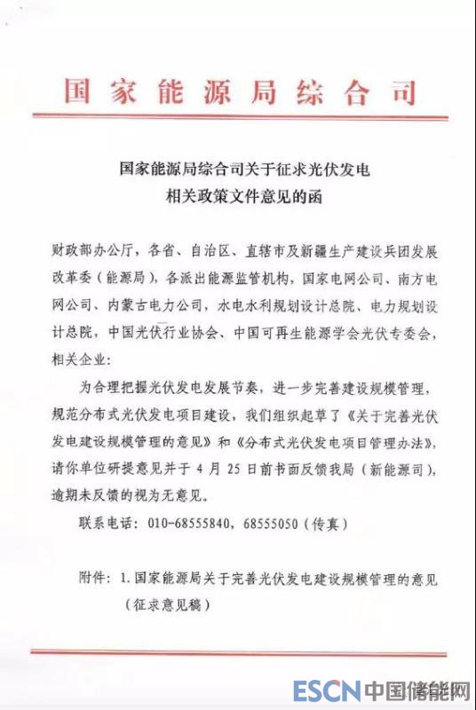 2018年4月13日,國家能源局對兩個文件征求意見,《關于完善光伏發(fā)電建設規(guī)模管理的通知》、《分布式光伏發(fā)電項目管理辦法(征求意見稿)》。