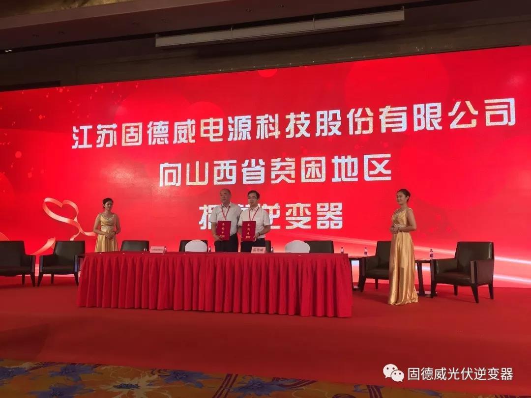 副總經(jīng)理侯祥勇先生(右)代表固德威向山西省貧困地區(qū)捐贈(zèng)光伏逆變器