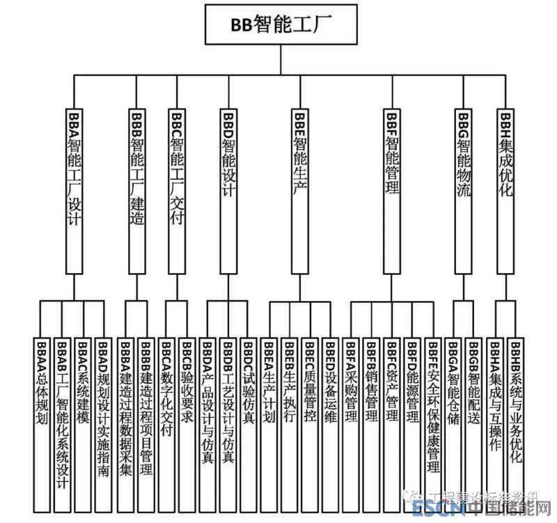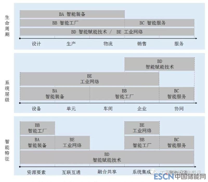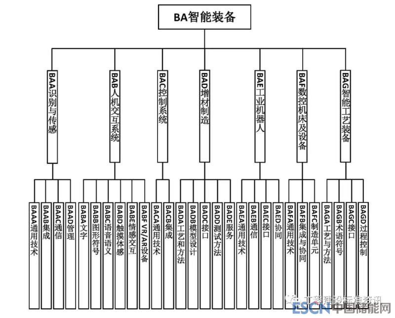 B關(guān)鍵技術(shù)中包括BA智能裝備、BB智能工廠、BC智能服務(wù)、BD智能賦能技術(shù)、BE工業(yè)網(wǎng)絡(luò)等五大類(lèi)標(biāo)準(zhǔn)。其中BA智能裝備主要對(duì)應(yīng)生命周期維度的設(shè)計(jì)、生產(chǎn)和物流,系統(tǒng)層級(jí)維度的設(shè)備和單元,以及智能特征維度中的資源要素;BB智能工廠主要對(duì)應(yīng)生命周期維度的設(shè)計(jì)、生產(chǎn)和物流,系統(tǒng)層級(jí)維度的車(chē)間和企業(yè),以及智能特征維度的資源要素和系統(tǒng)集成;BC智能服務(wù)主要對(duì)應(yīng)生命周期維度的銷(xiāo)售和服務(wù),系統(tǒng)層級(jí)維度的協(xié)同,以及智能特征維度的新興業(yè)態(tài);BD智能賦能技術(shù)主要對(duì)應(yīng)生命周期維度的全過(guò)程,系統(tǒng)層級(jí)維度的企業(yè)和協(xié)同,以及智能特征維度的所有環(huán)節(jié);BE工業(yè)網(wǎng)絡(luò)主要對(duì)應(yīng)生命周期維度的全過(guò)程,系統(tǒng)層級(jí)維度的設(shè)備、單元、車(chē)間和企業(yè),以及智能特征維度的互聯(lián)互通和系統(tǒng)集成。