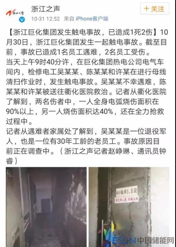 中國儲(chǔ)能網(wǎng)訊:當(dāng)天上午9時(shí)40分許,在巨化集團(tuán)熱電公司電氣車間內(nèi),檢修電工吳某某、陳某某和許某在進(jìn)行母線清掃作業(yè)時(shí),發(fā)生觸電事故。吳某某不幸遇難,陳某某和許某被送往衢化醫(yī)院救治。記者從衢化醫(yī)院了解到,兩名傷者中,一人全身電弧燒傷面積在90%以上,另一人燒傷面積達(dá)40%,還在全力搶救過程中。