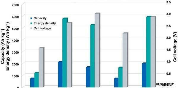 圖1不同金屬空氣電池的容量、能量密度和電壓對(duì)比