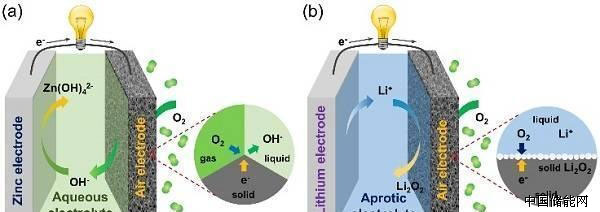 圖2堿性體系鋅空氣電池和非水體系鋰空氣電池的工作原理示意圖