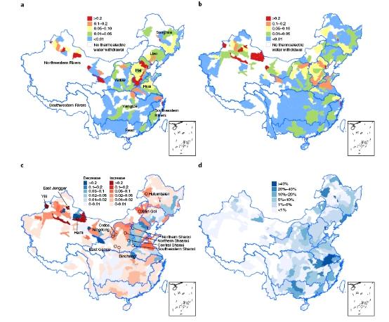 該研究發(fā)現(xiàn),海河流域大部分地區(qū)火電水資源壓力指數(shù)明顯下降,而西北大型煤電基地所處匯水區(qū)的壓力指數(shù)則顯著上升,為此建議西北地區(qū)煤電基地開發(fā)應(yīng)實行“取水總量控制”措施。該論文首次建立了我國長時間序列高分辨率火力發(fā)電用水地理信息數(shù)據(jù)庫,揭示了2000至2015年間火電取水、耗水及其水資源壓力的時空格局演變過程,并定量評估了多種影響因素對火力發(fā)電水資源利用效率提升的貢獻。該研究對我國制定合理的水資源管理政策和電力工業(yè)發(fā)展政策均具有重要的借鑒意義。